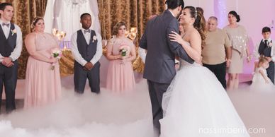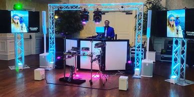 This Package consists of a DJ/MC with One sound system, and Ceremony sound system, Light up DJ booth, wireless microphones, Light up Truss system with complete club light and Laser show, Two LED 60” flat screen TV’s, personalized Monogram DJ Booth, Ceiling wash, Sparklers x 2, Dancing on clouds, Live Drummer/Percussionist, Up-lighting with choice of mixed colors or solid colors, set up break down. You can also add multiple wireless speakers to separate areas of the venue.