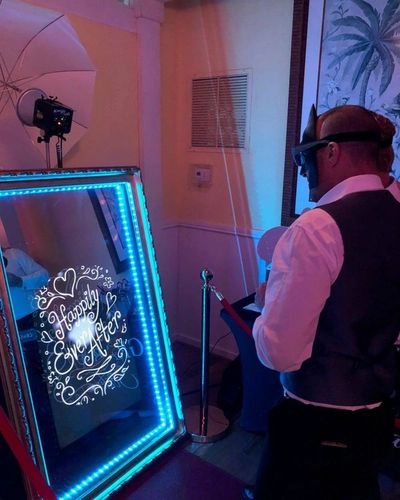 Our Mirror Package is interactive & fun consists of unlimited prints in black and white or color, customized logo or name and date on prints, Email copy as well as boomerangs and GIF'S, Props and Two attendants.
